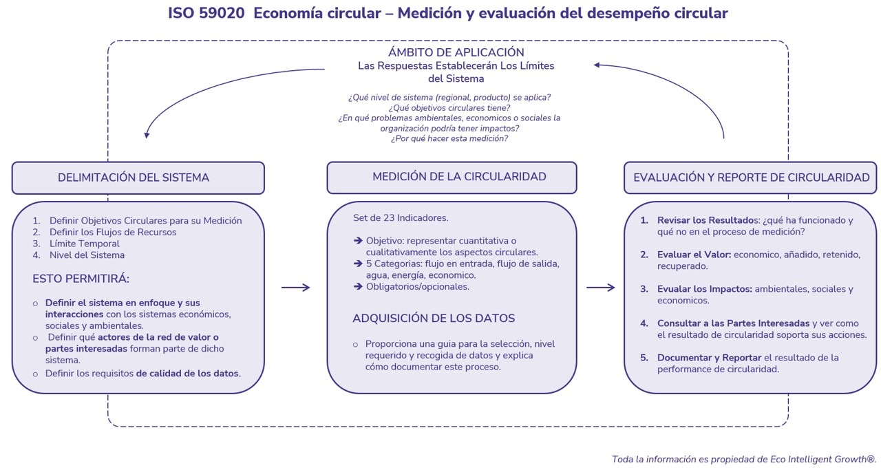 Esta ISO está conectada con la ISO 59010, enfocad en la transición hacia la circularidad para un modelo business oriented e ISO 59020 estructurada para medir y evaluar el desempeño y rendimiento de la circularidad.