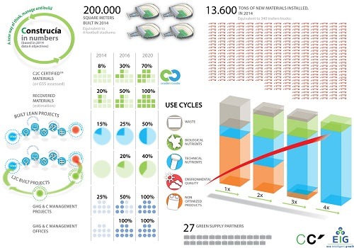 Since its incorporation to the Group, EIG is working internally in the definition of a roadmap to change Grupo Construcia’s business model to the circular economy. The General Direction is directly involved in the project and, despite of the complexity of the work, many steps have been done in the right direction, since its first public announcement in November 2013 at the Cercle d’Economia de Barcelona (Grupo Construcía towards the Circular Economy_ Círculo de Economía de Barcelona)